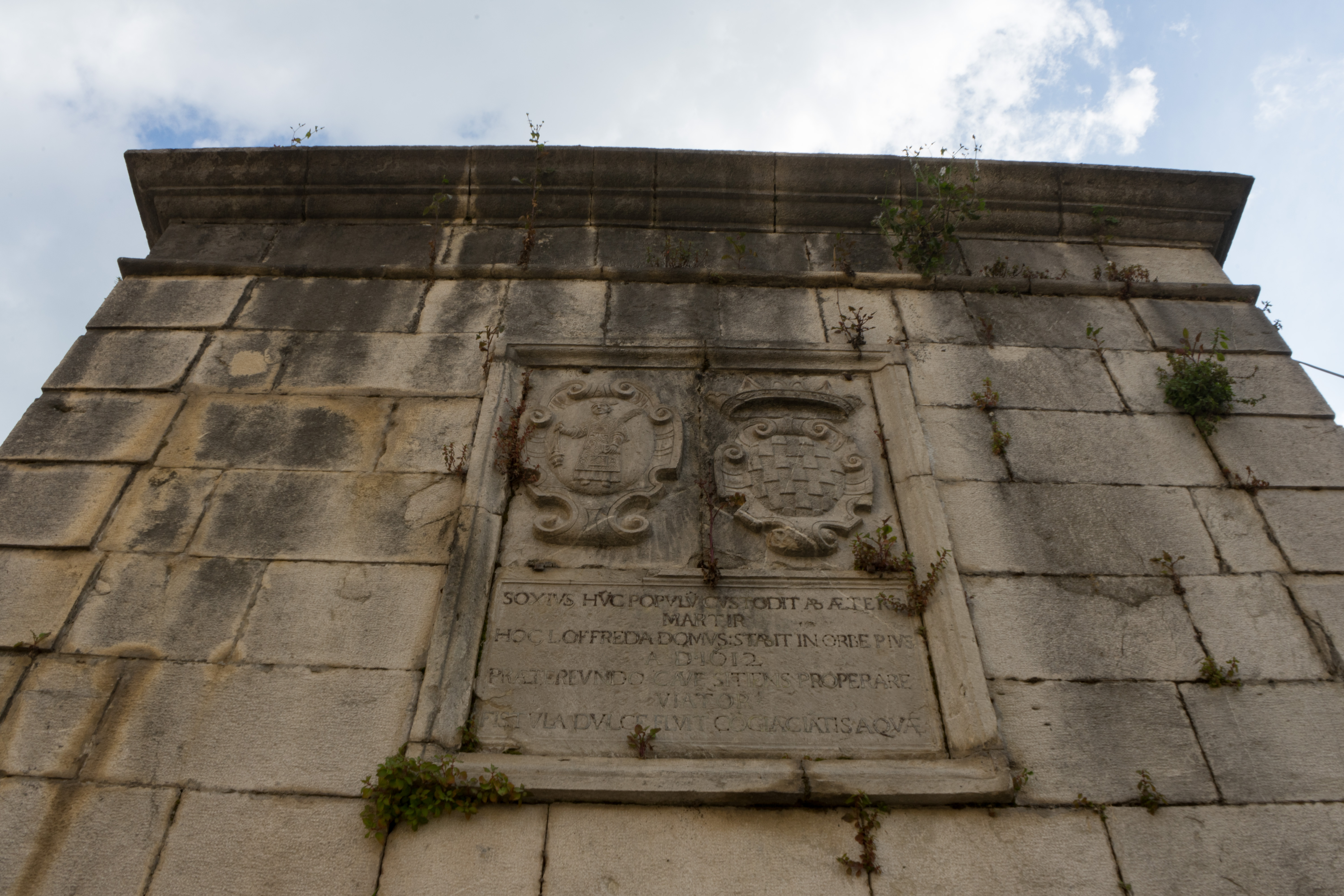 La parete, anch’essa sezionata in tre, presenta al centro una lapide, in cui si nota l’immagine di San Sossio Martire, lo stemma araldico dei Loffredo e una incisione latina, in cui si legge che il santo protegge il borgo dal cielo e che il feudatario sarà ricordato come beato nell'anno 1612, oltre ad un invito ai viaggiatori a sostare e rinfrescarsi in quel luogo di ristoro.
